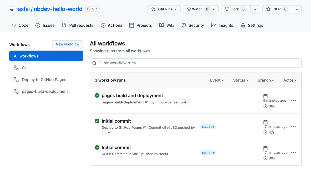 nbdev includes predefined workflows for continuous integration (CI) and deploying your documentation to GitHub Pages. The “CI” workflow runs tests and linters on your code whenever you push changes to your repository. The “Deploy to GitHub Pages” workflow builds and deploys your documentation to GitHub Pages.Let’s check out these workflows: