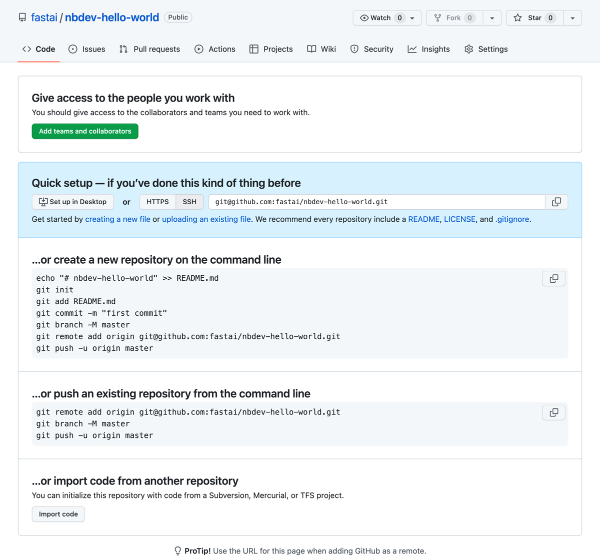 - Click the “Create repository” button to create the empty repository.